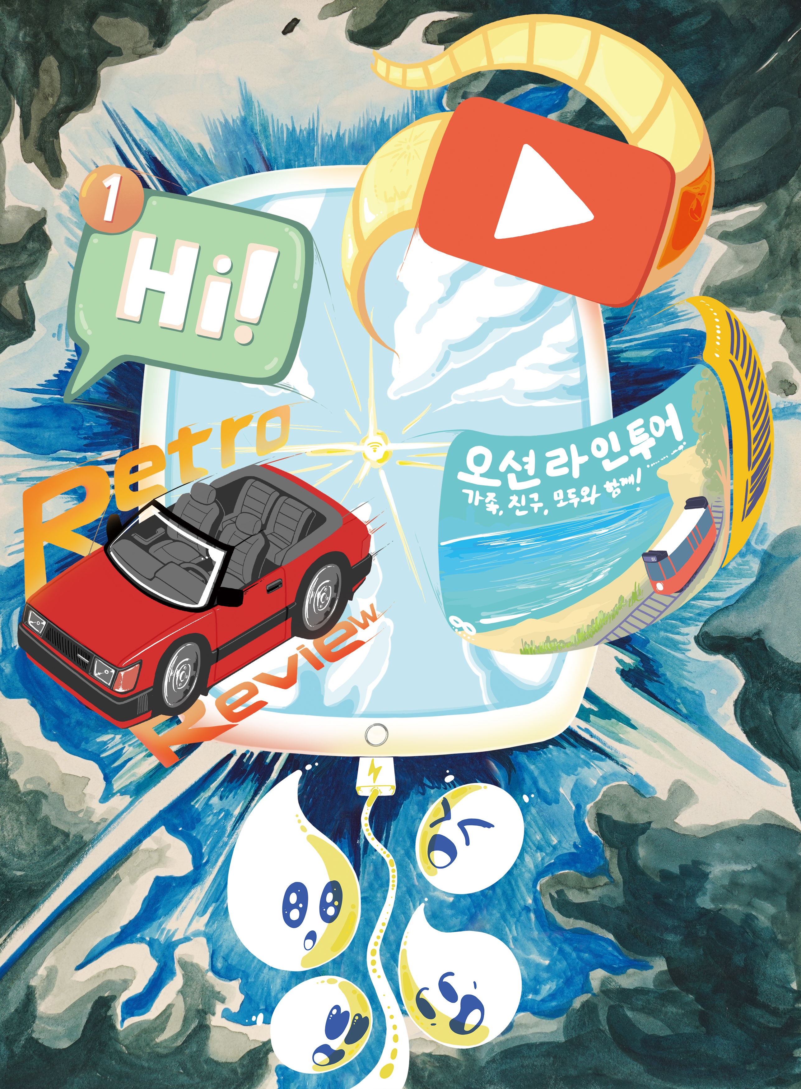 와이파이, 스마트폰, 태블릿 PC의 보급은 저를 비롯하여 수많은 사람들의 일상을 바꾸고 있습니다. 모두의 도파민이 폭발하는 일상 속의 즐거움도 마찬가지입니다. 저도 일상 속의 즐거움을 와이파이와 스마트폰, 태블릿 PC에서 많이 찾았고, 이들이 전달하는 다채로운 컨텐츠에 힘입어 기대감과 흥분감으로 가장 몰입되는 순간 중 하나로 자리잡았습니다. 태블릿 PC로부터 컨텐츠들이 쏟아지는 풍경을 통해 도파민이 폭발하며 분위기가 격변하는 순간과 그 강렬함을 표현하면서 디지털 드로잉으로 구현한 선명한 오브젝트들, 풍부하고 깊이가 있는 수채화로 구현한 배경을 조합하여 그에 걸맞는 강렬한 시각적 대비를 구현했습니다.