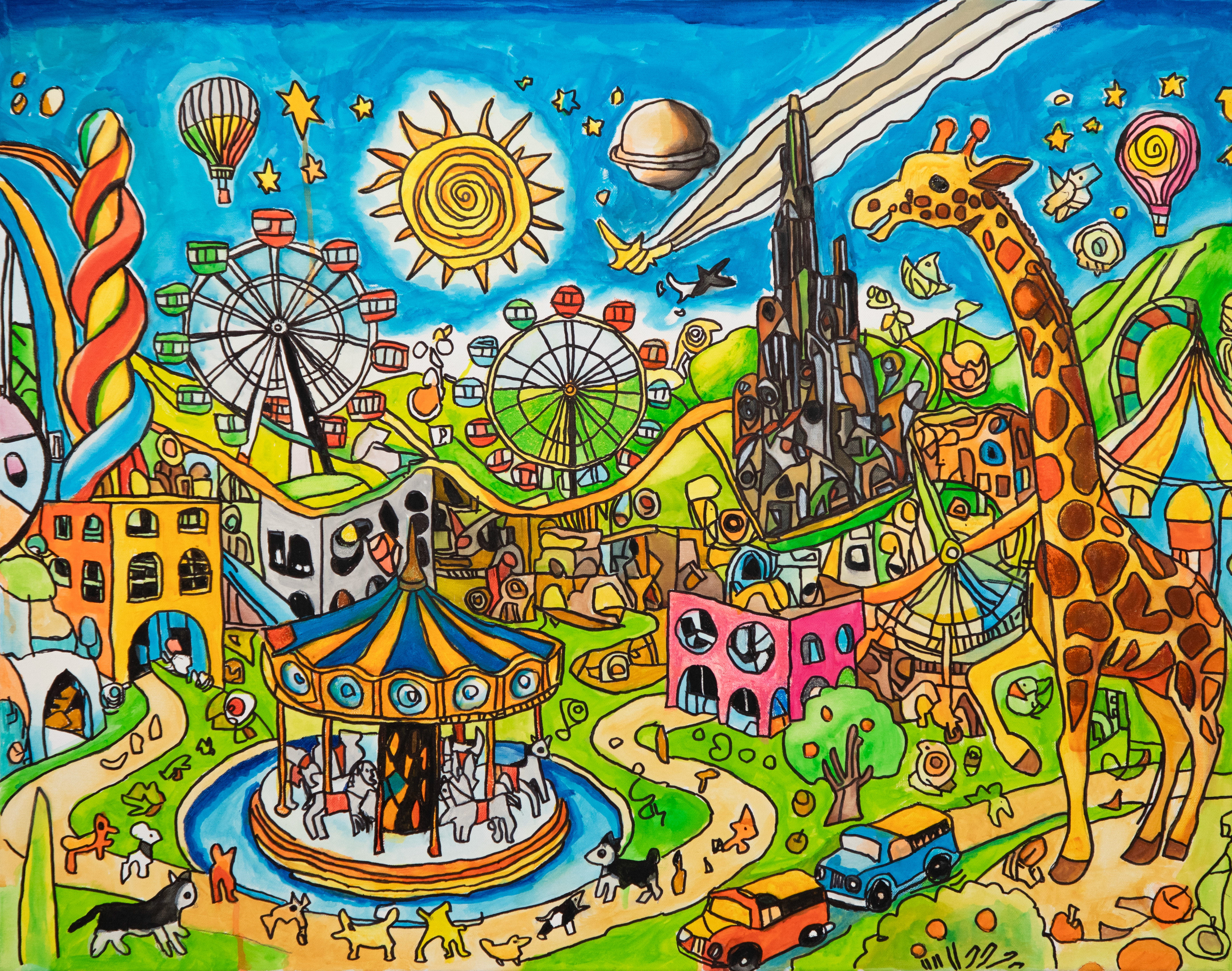 Let’s visit an amusement park in the starry universe! Riding colorful and exciting attractions, we soar high into the sky, where we can meet the gaze of a giraffe taller than the buildings.